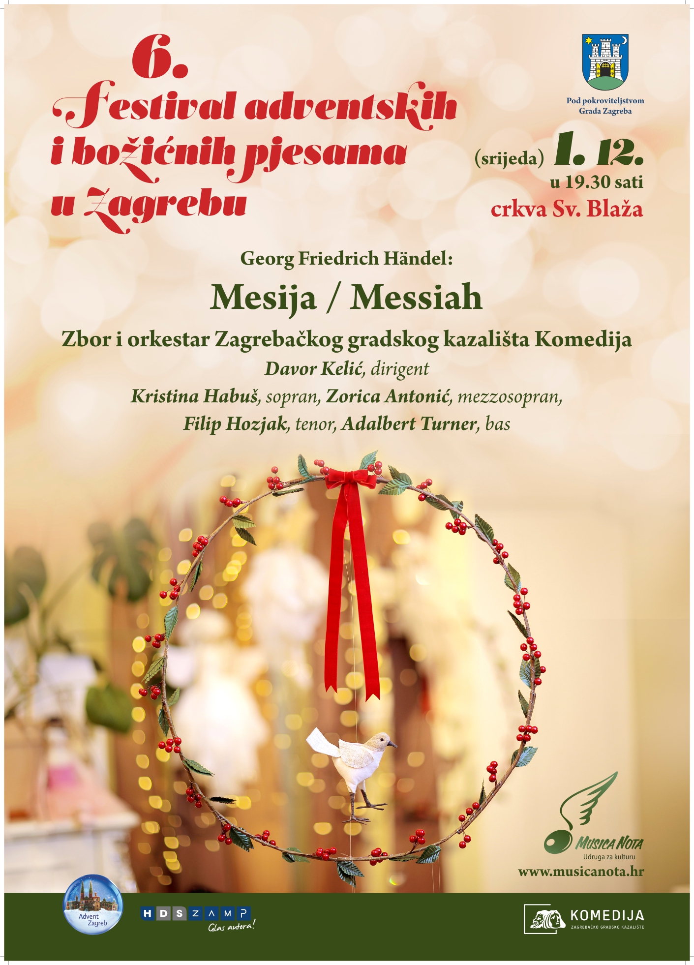 U srijedu, 1. prosinca 2021. u 19:30 sati u crkvi sv. Blaža u Zagrebu zbor i orkestar Kazališta Komedija te solisti Kristina Habuš (sopran), Zorica Antonić (mezzosopran), Filip Hozjak (tenor) i Adalbert Turner (bas) pod ravnanjem maestra Davora Kelića izvest će oratorij Mesija G. F. Händela.